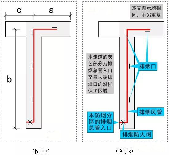 圖示13中,右側排煙風管所保護走道的最大走道長度L2=2a+2b,大于原則1的計算長度。