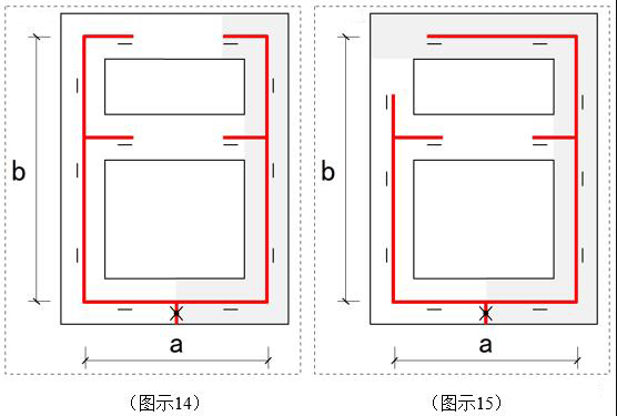 日形走道的計算方式和原則,與口形走道相同,示例中,圖示14的防煙分區長邊長度為a+b,在圖示15的防煙分區長邊長度為1.5a+b。