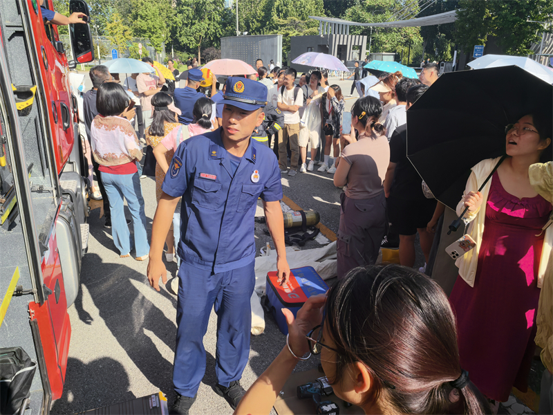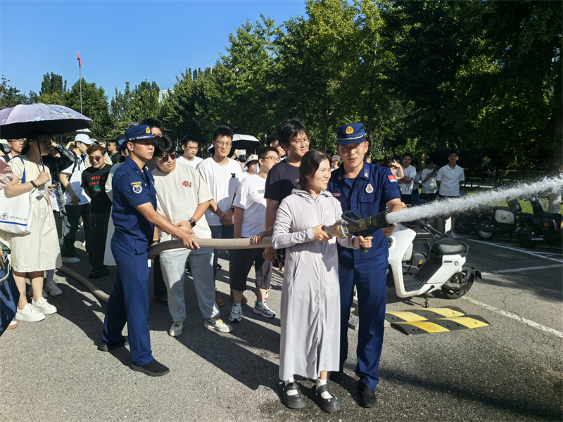 “我是第一次穿上這身衣服,沒想到行動這么笨重,手腳一點都不靈活,想想平時消防員穿戴這套裝備進行訓練,滅火時要穿著裝備爬樓,消防員們實在是太辛苦了。”首都醫科大學國際學院的學生一邊脫下戰斗服,一邊跟消防員說到。在活動現場,共設置消防技能培訓區、疏散逃生體驗區、消防裝備器材體驗區、消防車輛展示區、滅火器實操區、安全常識教育區六個區域,展示滅火、搶險救援各類消防車輛以及滅火、防護、破拆、救生、偵檢等消防器材裝備,吸引了眾多師生參觀體驗。消防員現場演示鋪設水帶滅火,講解消防安全知識、滅火器操作方法,手把手指導師生正確使用滅火器,讓師生“沉浸式”掌握滅火技能,并組織分組進行“滅真火,出真水”實操演練,給大家上了一堂精彩的消防知識教育課。
