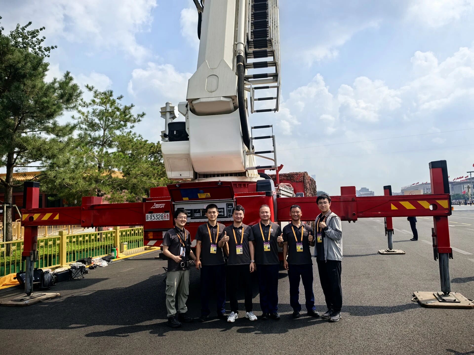 參與拍攝任務的云梯車專業名稱為博浪濤F55米登高救援平臺車,車臂可極限伸展55米。與賈孝龍相同的是,這輛云梯車也身經百戰,最近6年成功處置救援任務達455起。與賈孝龍不同的是,這輛云梯車曾在2015年紀念抗戰勝利70周年、2019年慶祝新中國成立70周年兩次盛典中執行過協助拍攝任務。