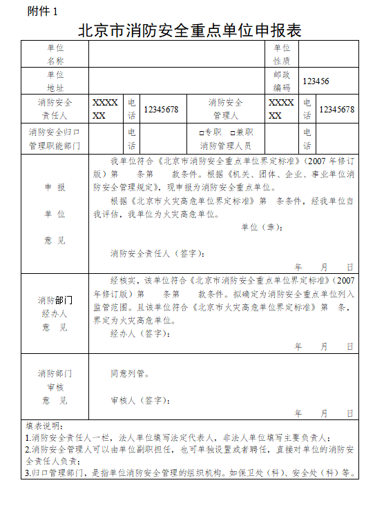 參考《北京市消防安全重點單位界定標準》(附件1)進行自評,符合界定標準的填寫《北京市消防安全重點單位申報表》(附件2)。其中,符合火災高危單位界定標準(附件3)的,按照消防安全重點單位備案要求同步申報。請于申報時間內將《北京市消防安全重點單位申報表》及單位身份證明材料復印件(單位蓋章、消防安全責任人簽字)報開發區消防救援支隊。